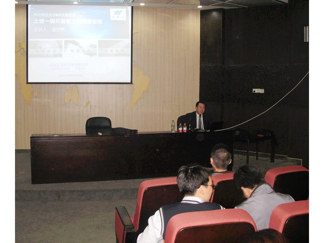 10月23日,應(yīng)華中師范大學(xué)MBA教育中心邀請,永業(yè)行總裁、華中師范大學(xué)MBA研究生導(dǎo)師潘世炳在華中師范大學(xué)做了“土地一級開發(fā)和土地征收儲備”的講座。潘總圍繞著土地一級開發(fā)及土地征收儲備基本概念、基本流程及相關(guān)技術(shù)、法律問題與同學(xué)們進(jìn)行了交流,同時對目前的房地產(chǎn)市場進(jìn)行了分析,并回答了同學(xué)們的提問。本次講座由華中師范大學(xué)經(jīng)濟(jì)學(xué)院院長鄧鴻乾教授主持,華中師范大學(xué)MBA學(xué)員120余人參加了講座。