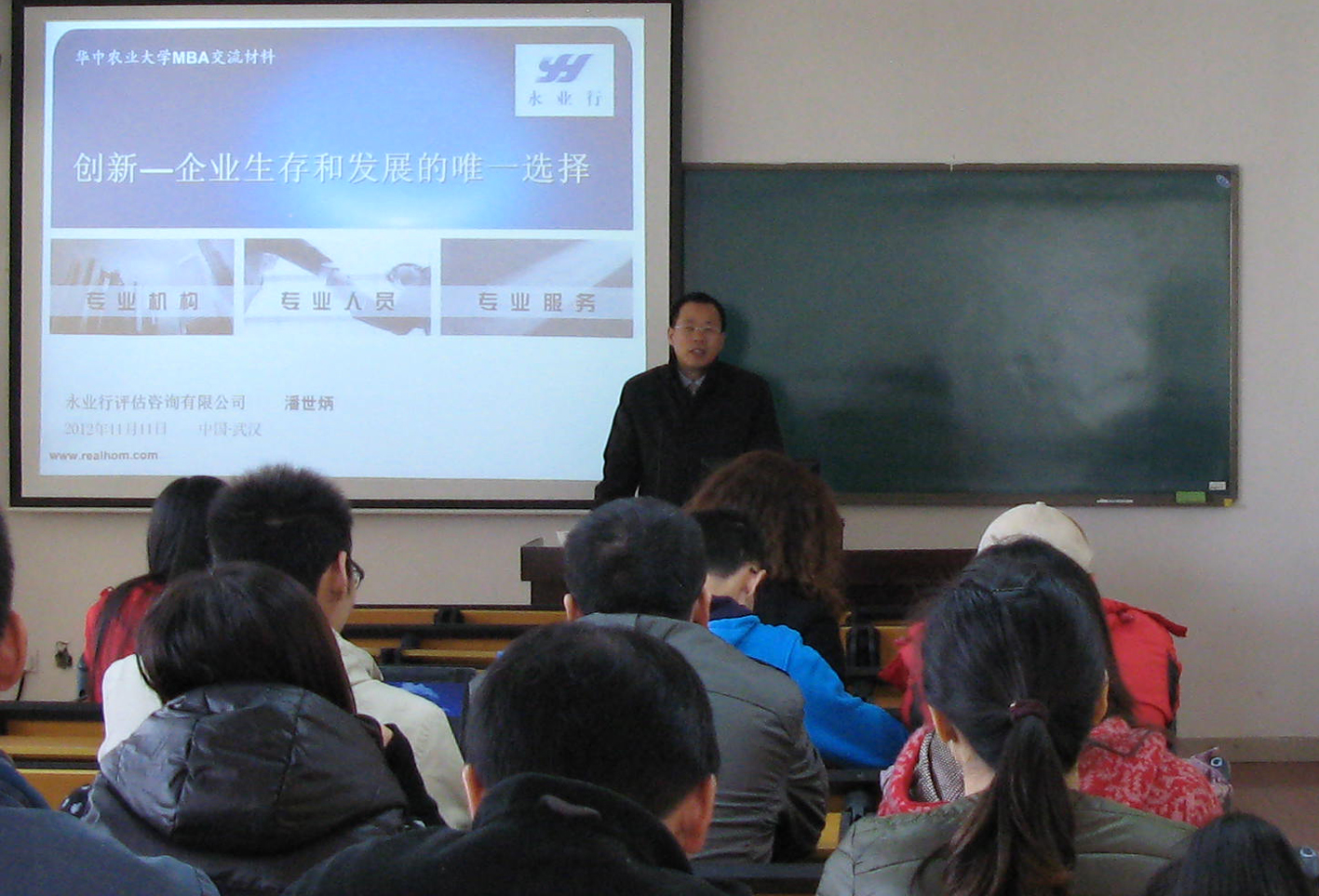 11月11日,應(yīng)華中農(nóng)業(yè)大學(xué)MBA教育中心邀請(qǐng),永業(yè)行總裁潘世炳給華中農(nóng)業(yè)大學(xué)近50名MBA、MPA研究生等作了題為《創(chuàng)新是企業(yè)生存和發(fā)展的唯一選擇》的專題講座,從為什么創(chuàng)新是企業(yè)生存和發(fā)展的唯一選擇、企業(yè)需要哪幾個(gè)方面的創(chuàng)新、企業(yè)創(chuàng)新應(yīng)該關(guān)注哪幾個(gè)問(wèn)題等三個(gè)方面,和同學(xué)們進(jìn)行了交流,并回答了大家的提問(wèn)。本次講座由華中農(nóng)業(yè)大學(xué)經(jīng)濟(jì)管理-土地管理學(xué)院嚴(yán)奉憲教授主持。