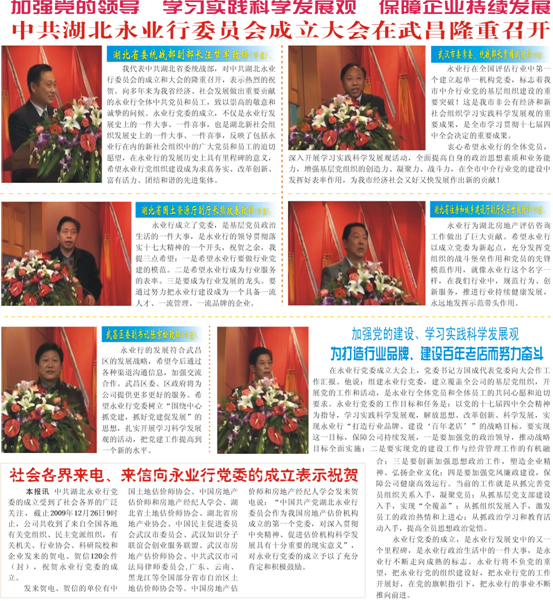 2009年12月26日,中國(guó)共產(chǎn)黨湖北永業(yè)行委員會(huì)成立大會(huì)在武昌隆重召開。湖北永業(yè)行黨委副書記、總裁潘世炳主持本次會(huì)議,中國(guó)土地估價(jià)師協(xié)會(huì)副會(huì)長(zhǎng)秦海榮專程赴武漢致賀,大會(huì)在莊嚴(yán)的國(guó)歌聲中開幕。
