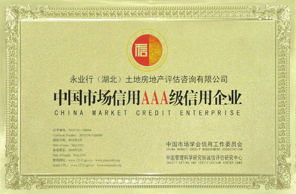 中國市場信用AAA級信用企業(yè)—永業(yè)行(湖北)土地房地產(chǎn)評估咨詢有限公司