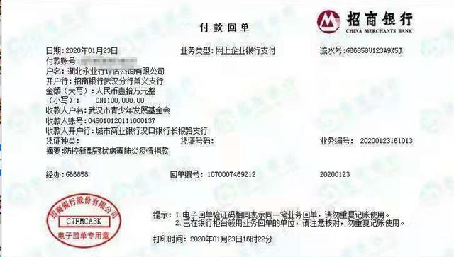 潘世炳是武漢永業(yè)行評估咨詢有限公司負責人。據(jù)該公司工作人員介紹,雖然潘世炳目前還在外處理業(yè)務,但他一直很關注武漢市新冠肺炎防治工作,在他和公司工作人員溝通下,今天下午公司正式將10萬元轉到武漢市青少年發(fā)展基金會賬戶,用于支持新型冠狀病毒感染的肺炎疫情防疫工作。