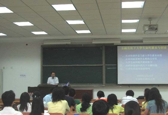 5月14日晚,永業(yè)行總裁潘世炳博士應(yīng)邀到中南財(cái)經(jīng)政法大學(xué),做了主題為《金融危機(jī)下大學(xué)生就業(yè)與創(chuàng)業(yè)問題》的講座。內(nèi)容包括金融危機(jī)下就業(yè)現(xiàn)狀、企業(yè)需要什么樣的大學(xué)生、大學(xué)生如何提高就業(yè)能力以及大學(xué)生創(chuàng)業(yè)問題等,并回答了大家提出的問題。