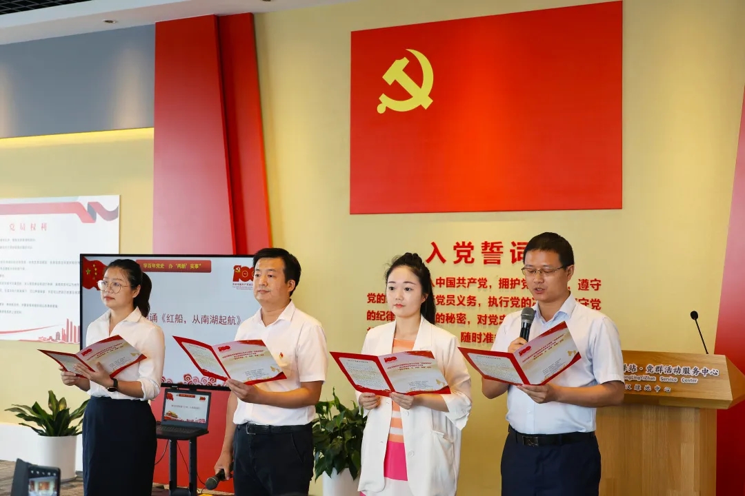 活動中全體成員重溫入黨誓詞,認真聆聽了由武漢中共中央機關舊址紀念館副館長、武漢市黨史宣講團成員周靜講授特色黨課《辦好中國的事情關鍵在黨》,觀看了區(qū)委組織部、區(qū)委宣傳部指導拍攝的黨史教育宣傳片《珞珈紅脈——周恩來在珞珈山》,區(qū)商務局、徐家棚街、中鐵物貿、國能華中四名青年黨會員代表朗誦紅色詩歌《紅船,從南湖起航》,全體黨員合唱《沒有共產(chǎn)黨就沒有新中國》,集體接受黨史學習教育。