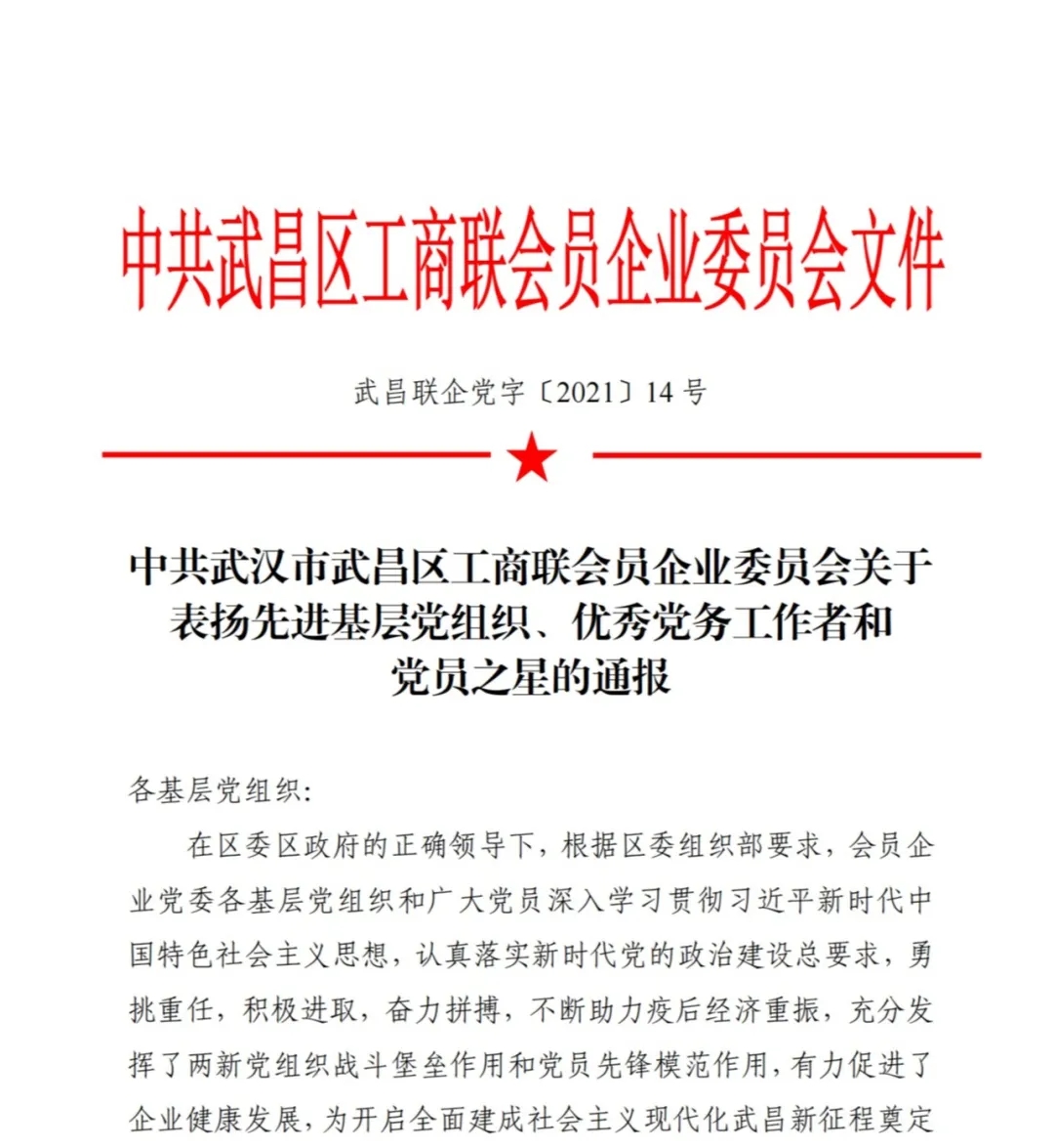 在慶祝黨的百年華誕之際,7月30日,中共武漢市武昌區(qū)工商聯(lián)會(huì)員企業(yè)委員會(huì)發(fā)文(武昌聯(lián)企黨字〔2021〕14 號(hào)),對(duì)會(huì)員企業(yè)先進(jìn)基層黨組織、優(yōu)秀黨務(wù)工作者和黨員之星進(jìn)行表彰,永業(yè)行黨委獲評(píng)“先進(jìn)基層黨組織”,周小川等20名黨員獲評(píng)“黨員之星”。
