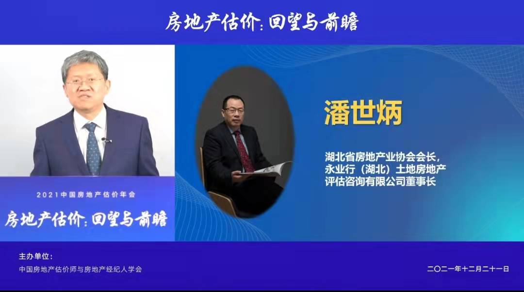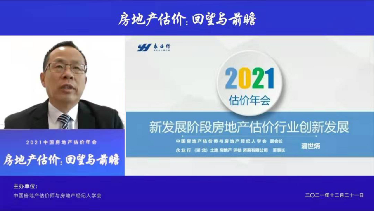 2021年12月21日,中國房地產(chǎn)估價師與房地產(chǎn)經(jīng)紀人學會(以下簡稱“中房學”)在北京召開中國房地產(chǎn)估價年會。根據(jù)當前疫情防控要求,本次會議以線上方式舉辦。中房學會長柴強、中國社會科學院房地產(chǎn)金融研究中心主任尹中立等專家學者及行業(yè)領(lǐng)袖共聚一堂,回顧行業(yè)發(fā)展邏輯與趨勢,探索未來轉(zhuǎn)型升級新路徑。中房學副會長、湖北省房地產(chǎn)業(yè)協(xié)會會長、永業(yè)行董事長潘世炳受邀發(fā)表《新發(fā)展階段房地產(chǎn)估價行業(yè)創(chuàng)新發(fā)展》的主題演講。