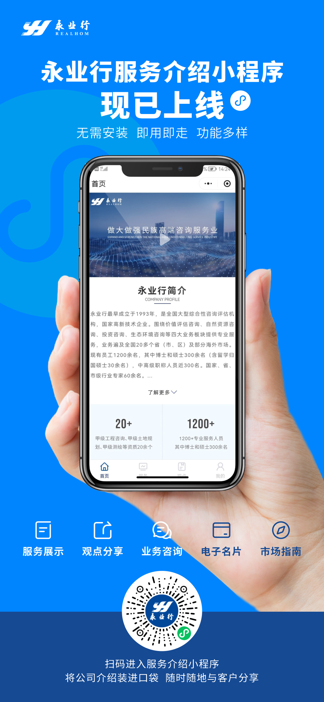 2022年4月22日,永業(yè)行服務(wù)介紹小程序正式上線,為各級政府、平臺公司、大型企業(yè)集團提供行業(yè)資訊和公司介紹服務(wù),包括服務(wù)展示、專業(yè)觀點、互動交流、電子名片、推廣海報等多個功能。