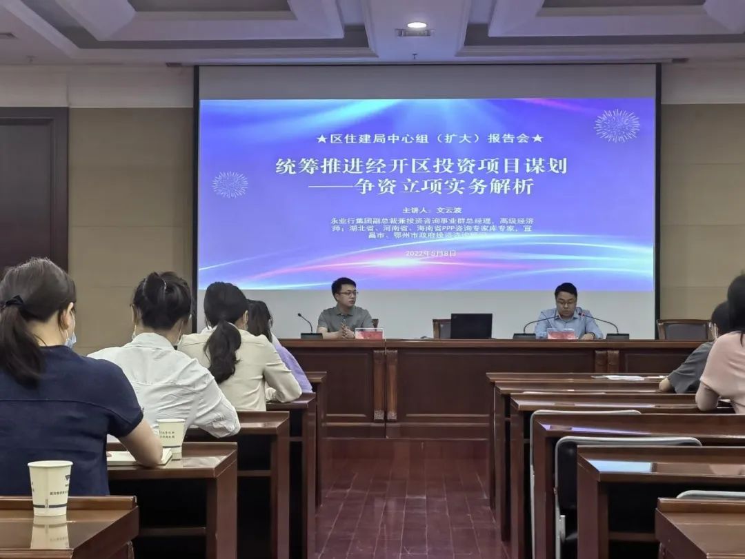 2022年5月8日,永業(yè)行咨詢評估集團副總裁文云波應(yīng)邀為武漢經(jīng)開區(qū)(漢南區(qū))住房和城鄉(xiāng)建設(shè)局作“統(tǒng)籌推進經(jīng)開區(qū)投資項目謀劃——爭資立項實務(wù)解析”專題交流培訓(xùn)。武漢經(jīng)開區(qū)(漢南區(qū))住房和城鄉(xiāng)建設(shè)局黨組書記、局長樊友川主持會議。