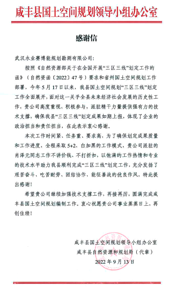 2022年9月13日,咸豐縣國土空間規(guī)劃領(lǐng)導(dǎo)小組辦公室致函永業(yè)行,對我司參與的咸豐縣國土空間規(guī)劃“三區(qū)三線”劃定工作給予肯定和感謝。