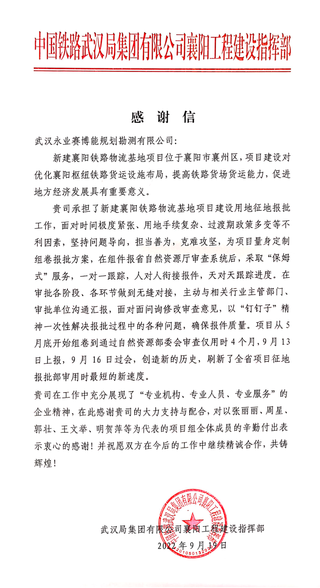 2022年9月19日,中國鐵路武漢局集團(tuán)有限公司襄陽工程建設(shè)指揮部致函永業(yè)行,對我司承擔(dān)的新建襄陽鐵路物流基地項(xiàng)目用地報(bào)批工作給予肯定和感謝。