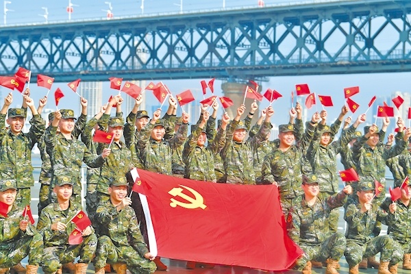 10月16日,武警湖北總隊武漢支隊船艇大隊官兵開展“我與黨旗來合影”活動,慶祝黨的二十大勝利召開。(視界網(wǎng) 謝定安 唐偉 攝)