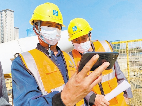 10月16日,中建三局的建設者在項目工地上用手機收看黨的二十大開幕會盛況。(湖北日報全媒記者 柯皓 通訊員 謝杰夫 朱楨源 攝)