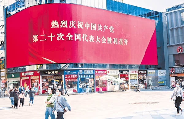 10月16日,武漢市江漢路步行街超大型電子顯示屏循環(huán)播放標語,讓市民們感受到了濃厚的盛會氛圍。(湖北日報全媒記者 朱熙勇 攝)