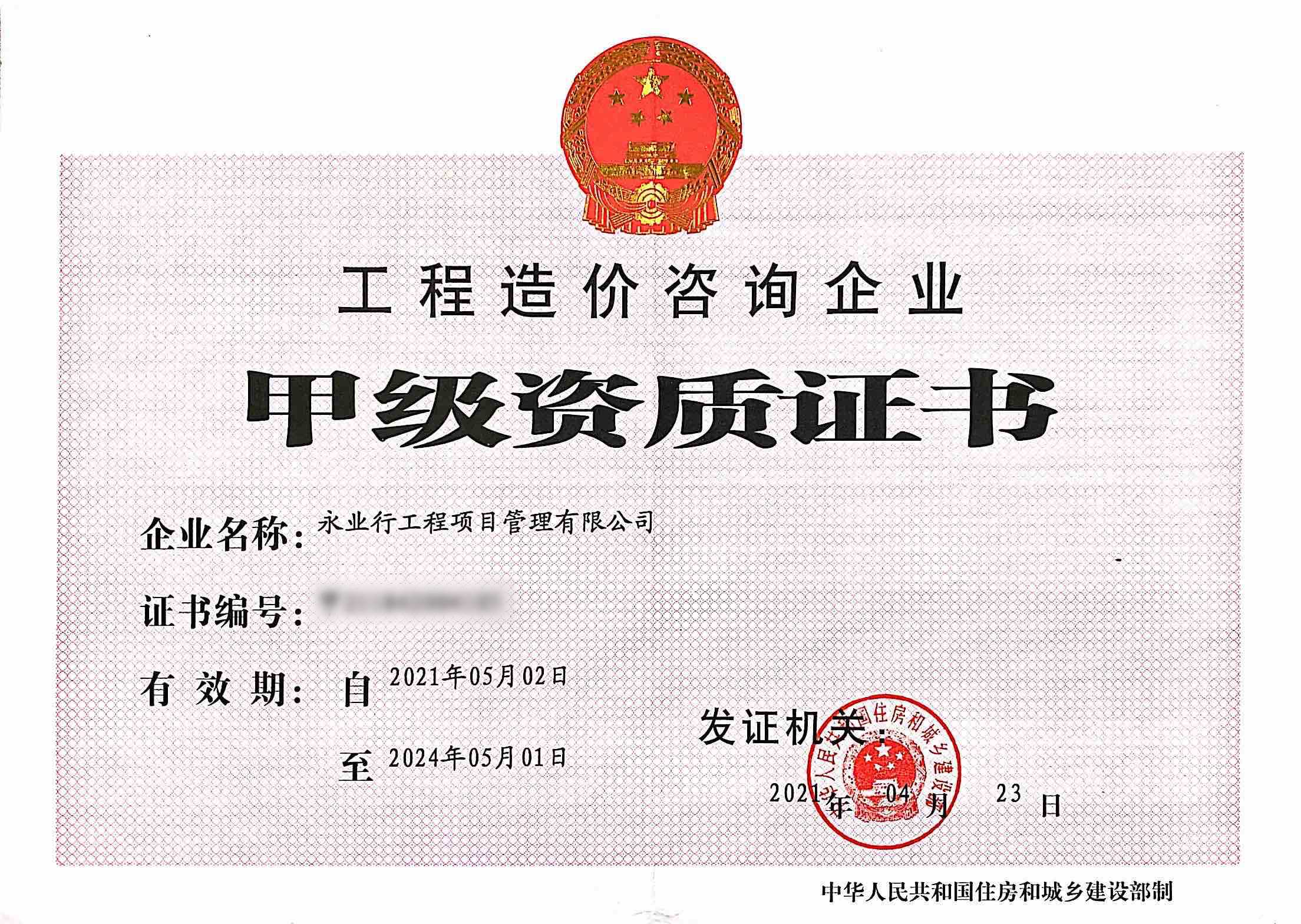 工程造價咨詢企業(yè)甲級資質(zhì)證書
