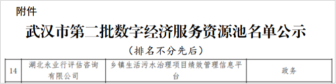 近日,武漢市經(jīng)濟(jì)和信息化局公布第二批數(shù)字經(jīng)濟(jì)服務(wù)資源池遴選工作評(píng)審結(jié)果,湖北永業(yè)行評(píng)估咨詢有限公司自主研發(fā)的《鄉(xiāng)鎮(zhèn)生活污水治理項(xiàng)目績(jī)效管理信息平臺(tái)》成功入選。