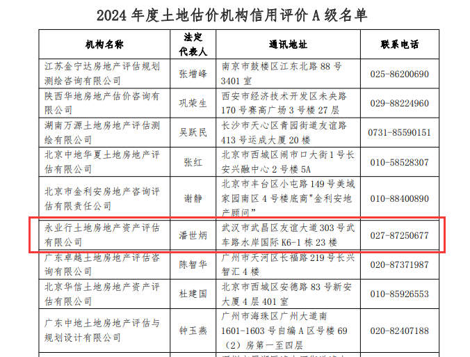 12月4日,中國土地估價(jià)師與土地登記代理人協(xié)會(huì)(下稱“中估協(xié)”)公布“2024年度土地估價(jià)機(jī)構(gòu)信用評(píng)價(jià)(A級(jí)資信)名單”,此次公布榮獲土地估價(jià)機(jī)構(gòu)信用評(píng)價(jià)A級(jí)共120家、準(zhǔn)A級(jí)共30家,永業(yè)行位列全國第六、湖北第一,連續(xù)16年獲評(píng)“土地估價(jià)機(jī)構(gòu)信用評(píng)價(jià)A級(jí)”。