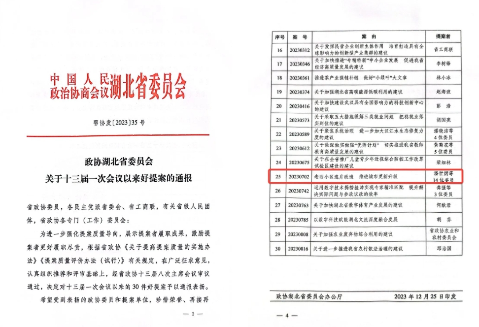 2023年1月,潘世炳向湖北省政協(xié)十三屆一次會(huì)議提交了《老舊小區(qū)連片改造 推進(jìn)城市更新升級(jí)》提案,獲湖北日?qǐng)?bào)、湖北衛(wèi)視、湖北經(jīng)視、長江日?qǐng)?bào)、長江云等多家媒體報(bào)道,并作為省政協(xié)重點(diǎn)提案獲湖北省副省長張文彤領(lǐng)辦。提案中指出,我省城建發(fā)展還存在一些不足,比如城市功能品質(zhì)亟待提升、市政基礎(chǔ)設(shè)施老化破損的改造需求較大、老舊城區(qū)更新改造需求較大、對(duì)市場化資金撬動(dòng)力度需加強(qiáng)。提案建議從加速推進(jìn)城市更新和老舊小區(qū)片區(qū)化改造、引導(dǎo)多主體協(xié)同推進(jìn)、打通項(xiàng)目多元化資金籌措渠道等方面著手,大力推進(jìn)老舊小區(qū)改造與城市更新協(xié)同,構(gòu)建城市發(fā)展新模式。