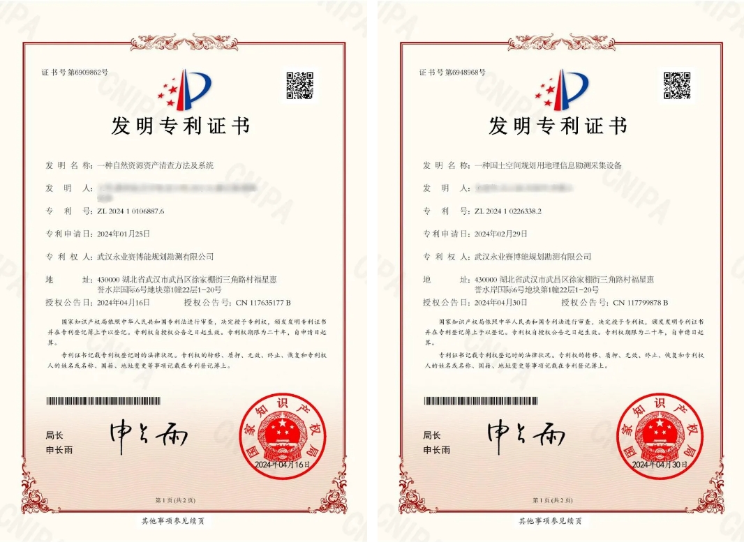 近日,永業(yè)行申報(bào)的發(fā)明專利《一種自然資源資產(chǎn)清查方法及系統(tǒng)》《一種國(guó)土空間規(guī)劃用地理信息勘測(cè)采集設(shè)備》獲得國(guó)家知識(shí)產(chǎn)權(quán)局授權(quán),為公司的創(chuàng)新發(fā)展再添新動(dòng)力。