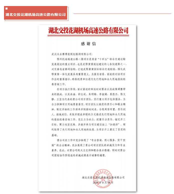 近期,永業(yè)行陸續(xù)收到來自武漢都市區(qū)環(huán)線北段投資管理有限公司、湖北交投武黃改擴(kuò)建高速公路建設(shè)有限公司、湖北交投花湖機(jī)場高速公路有限公司發(fā)來的表揚(yáng)信和感謝信。