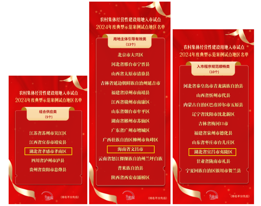 近日,自然資源部公布了《農(nóng)村集體經(jīng)營性建設(shè)用地入市試點2024年度典型示范案例試點地區(qū)名單》,全國共有44個試點地區(qū)入選典型示范案例,其中,永業(yè)行提供技術(shù)服務(wù)的湖北省孝感市孝南區(qū)、海南省文昌市以及參與地價評估的湖北省宜昌市夷陵區(qū)深化農(nóng)村集體經(jīng)營性建設(shè)用地入市試點(以下簡稱“入市”)項目分別被評為“組合供應(yīng)類”“用地主體引導(dǎo)有效類”“入市程序規(guī)范順暢類”典型示范案例。