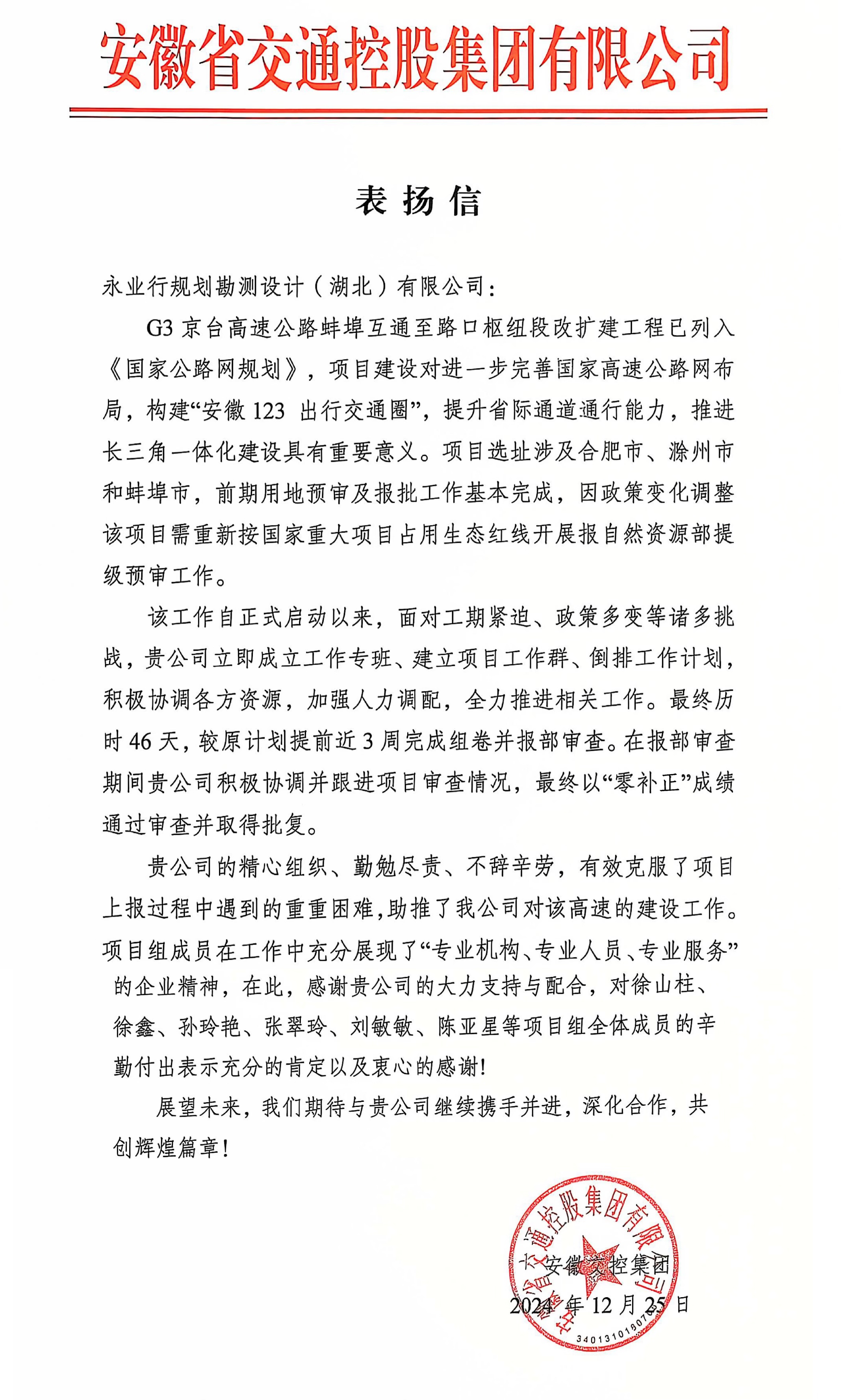 感謝信稱,G3京臺高速公路蚌埠互通至路口樞紐段改擴建工程已列入《國家公路網(wǎng)規(guī)劃》,項目建設(shè)對進一步完善國家高速公路網(wǎng)布局,構(gòu)建“安徽123出行交通圈”,提升省際通道通行能力,推進長三角一體化建設(shè)具有重要意義。自永業(yè)行承接項目提級預(yù)審以來,面對工期緊迫、政策多變等諸多挑戰(zhàn),項目組成員(徐山柱、徐鑫、孫玲艷、張翠玲、劉敏敏、陳亞星、章磊、韓琴、房吳宇、趙勇)展現(xiàn)了高度的專業(yè)精神和職業(yè)素養(yǎng),通過對新政策、新規(guī)則的精準(zhǔn)把控,合理分解任務(wù),有效解決問題,最終歷時46天,較原計劃提前近3周完成組卷并報部審查,以“零補正”通過審批,獲得業(yè)主好評。