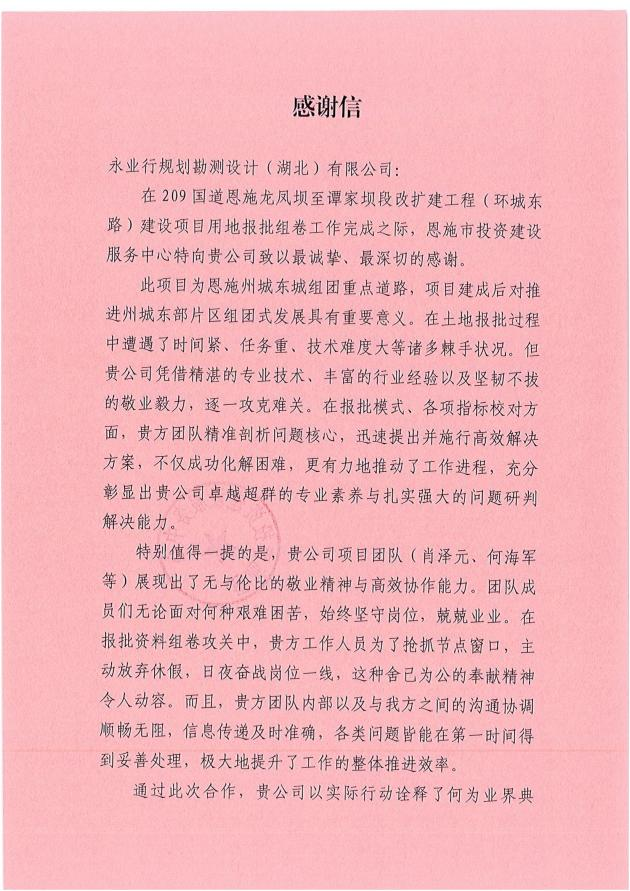 感謝信中對永業(yè)行鄂西區(qū)承擔(dān)209國道恩施龍鳳壩至譚家壩段改擴建工程(環(huán)城東路)表達了充分的感謝,贊許了項目團隊(肖澤元、何海軍)在面臨土地報批時遇到時間緊、任務(wù)重、技術(shù)難度大等問題時,始終堅守崗位、兢兢業(yè)業(yè),為搶抓節(jié)點窗口,主動放棄休假,日夜奮戰(zhàn)崗位一線,展現(xiàn)出無與倫比的敬業(yè)精神和高效協(xié)作能力,團隊內(nèi)部以及與各方之間的溝通協(xié)調(diào)順暢無阻,信息傳遞及時準(zhǔn)確,確保了問題在第一時間得到妥善處理,大大提高了工作效率,最終確保項目用地報批組卷工作按時完成,為項目的順利實施創(chuàng)造了有利條件。