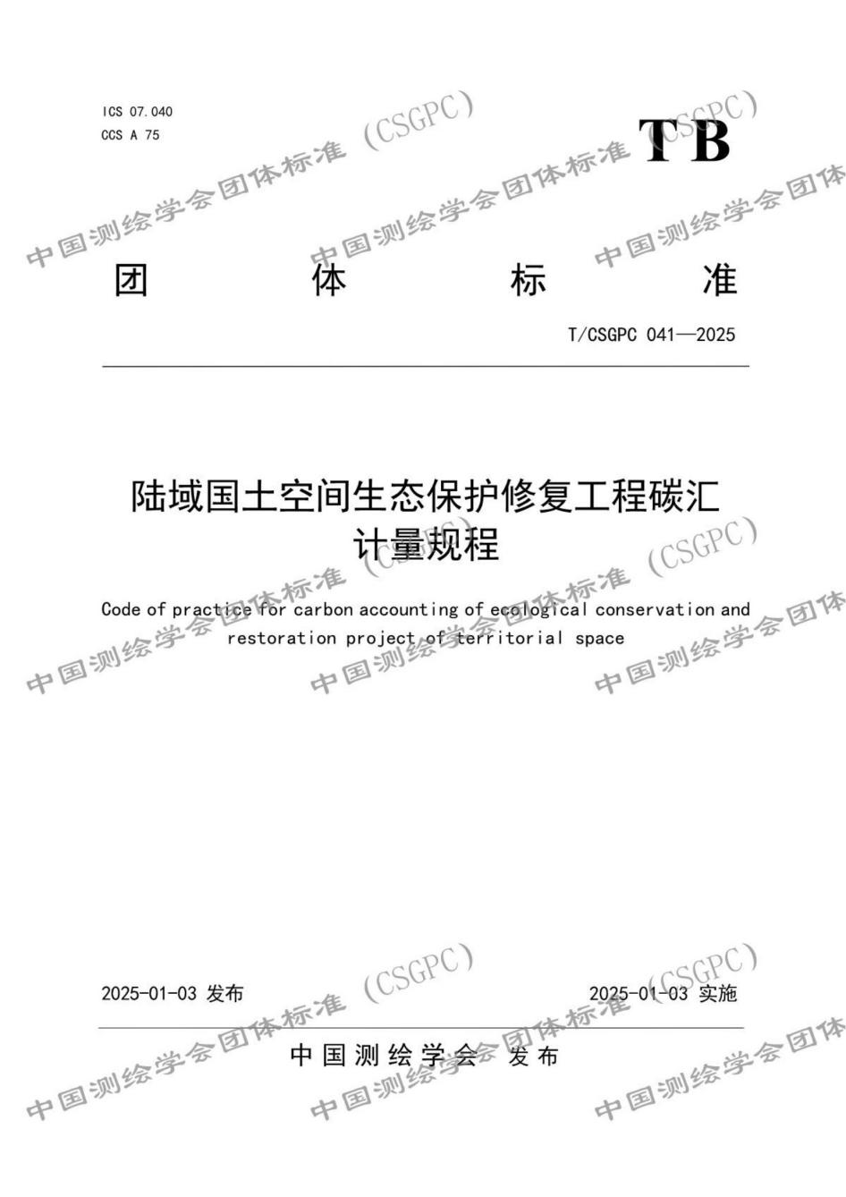 近日,中國測繪學(xué)會(huì)發(fā)布了《陸域國土空間生態(tài)保護(hù)修復(fù)工程碳匯計(jì)量規(guī)程》(T/CSGPC 041-2025)CSGPC標(biāo)準(zhǔn)(簡稱《規(guī)程》)。《規(guī)程》由武漢市測繪研究院牽頭,中國測繪科學(xué)研究院、北京市測繪設(shè)計(jì)研究院、湖北省林業(yè)科學(xué)研究院、中國科學(xué)院生態(tài)環(huán)境研究中心、自然資源部測繪標(biāo)準(zhǔn)化研究所、武漢大學(xué)、湖北省地質(zhì)調(diào)查院、永業(yè)行等單位共同編制。《規(guī)程》為首個(gè)針對國土空間生態(tài)保護(hù)修復(fù)工程的碳匯計(jì)量團(tuán)體標(biāo)準(zhǔn)。