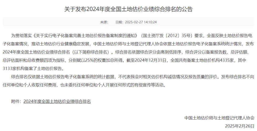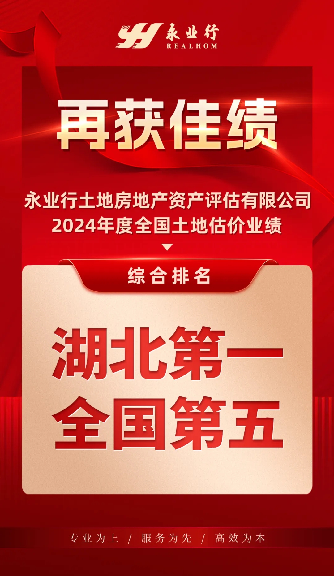 2025年2月26日,中國土地估價師與土地登記代理人協(xié)會發(fā)布《2024年度全國土地估價業(yè)績綜合排名的公告》,在全國4335家備案土地估價機構中,永業(yè)行土地房地產資產評估有限公司綜合排名湖北第一、全國第五。