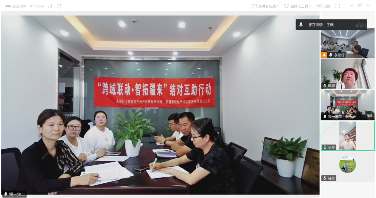 為深入貫徹中估協(xié)土地估價行業(yè)結(jié)對互助工作部署,推動行業(yè)資源整合與協(xié)同發(fā)展,2025年7月2日,永業(yè)行與結(jié)對互助機(jī)構(gòu)新疆源信地產(chǎn)評估事務(wù)有限責(zé)任公司(以下簡稱“新疆源信”)以視頻連線形式召開座談會,共同啟動“跨域聯(lián)動 智拓疆來”結(jié)對互助行動。永業(yè)行聯(lián)席總裁王琴,新疆源信副總經(jīng)理邱娜、技術(shù)總監(jiān)辛菊芳等參加交流。永業(yè)行技術(shù)副總監(jiān)、技術(shù)中心總經(jīng)理李冀云主持會議。