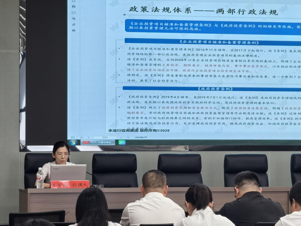 2025年8月15日,潛江市高新技術(shù)產(chǎn)業(yè)投資開發(fā)有限公司(下稱“潛江市高新投”)舉辦2025年干部素質(zhì)提升培訓(xùn)會。潛江市高新投黨委副書記從政、副總經(jīng)理郭雄出席會議。永業(yè)行投資金融事業(yè)群工程咨詢事業(yè)部總監(jiān)王成成受邀作《政府投資項目的全流程管理及實操解析》專題培訓(xùn)交流。