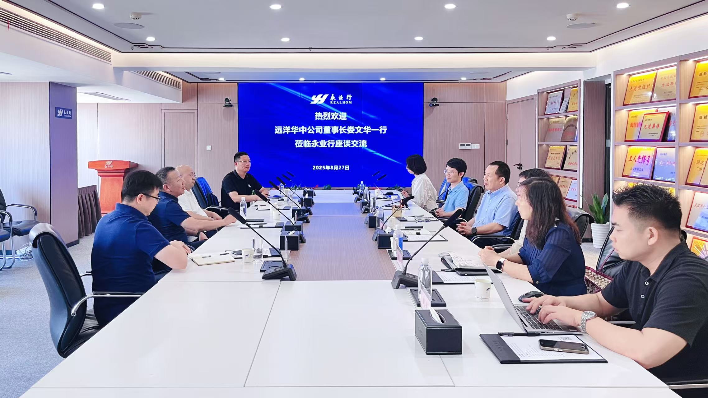 8月27日,遠洋華中公司董事長、總經理婁文華一行蒞臨永業(yè)行,就新形勢下的城市更新業(yè)務開展交流。永業(yè)行董事長潘世炳、常務副總裁文云波等熱情接待并參加座談交流。