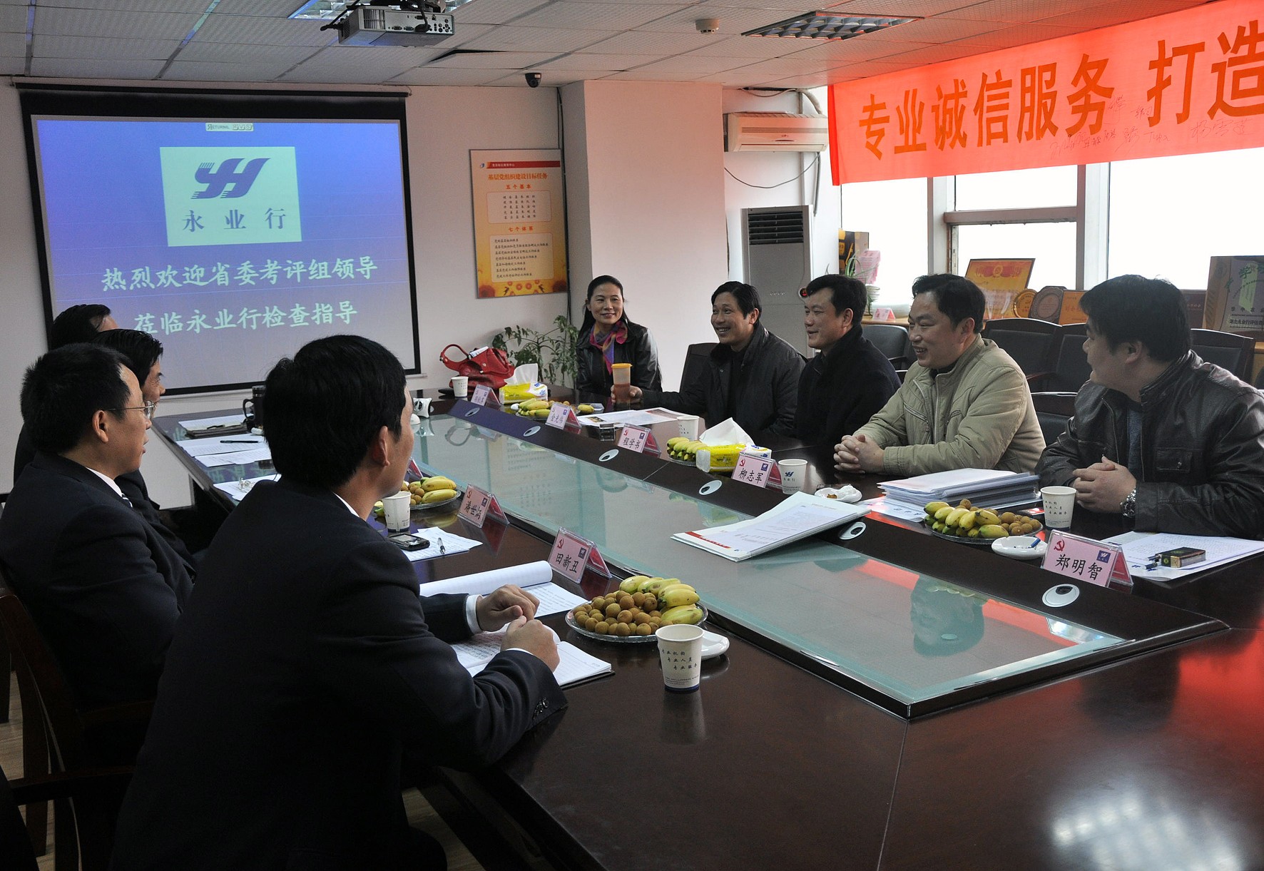 永業(yè)行黨委書(shū)記、董事長(zhǎng)方國(guó)成,黨委副書(shū)記、總裁潘世炳,黨委副書(shū)記、副總裁靳劍輝,黨委委員、助理總裁田新丑熱情接待了省委考評(píng)組領(lǐng)導(dǎo)??荚u(píng)組觀看永業(yè)行宣傳片后,方董向考評(píng)組領(lǐng)導(dǎo)詳細(xì)介紹了公司的基本情況,匯報(bào)了永業(yè)行黨建工作;潘總對(duì)考評(píng)組領(lǐng)導(dǎo)的提問(wèn)逐一作了解答和說(shuō)明,并就企業(yè)黨建和組織發(fā)展等問(wèn)題向考評(píng)組提出了建議。考評(píng)組聽(tīng)取工作匯報(bào)并認(rèn)真檢查永業(yè)行黨建工作有關(guān)資料后,對(duì)永業(yè)行黨建工作、創(chuàng)先爭(zhēng)優(yōu)活動(dòng)的開(kāi)展予以了充分肯定。