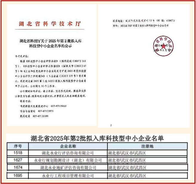 近日,湖北省科技廳公布了2025年第2批科技型中小企業(yè)入庫名單,永業(yè)行旗下4家公司入選,包括湖北永業(yè)行評估咨詢有限公司、永業(yè)行規(guī)劃勘測設(shè)計(湖北)有限公司、湖北永業(yè)地礦評估咨詢有限公司、永業(yè)行工程項目管理有限公司,4家公司均連續(xù)三年獲此稱號。