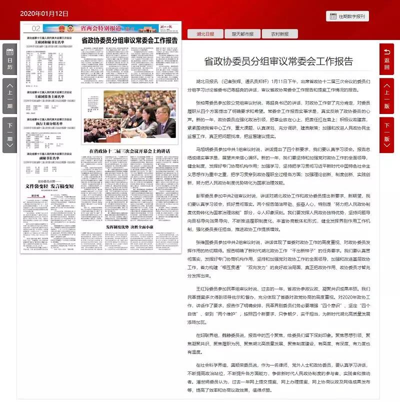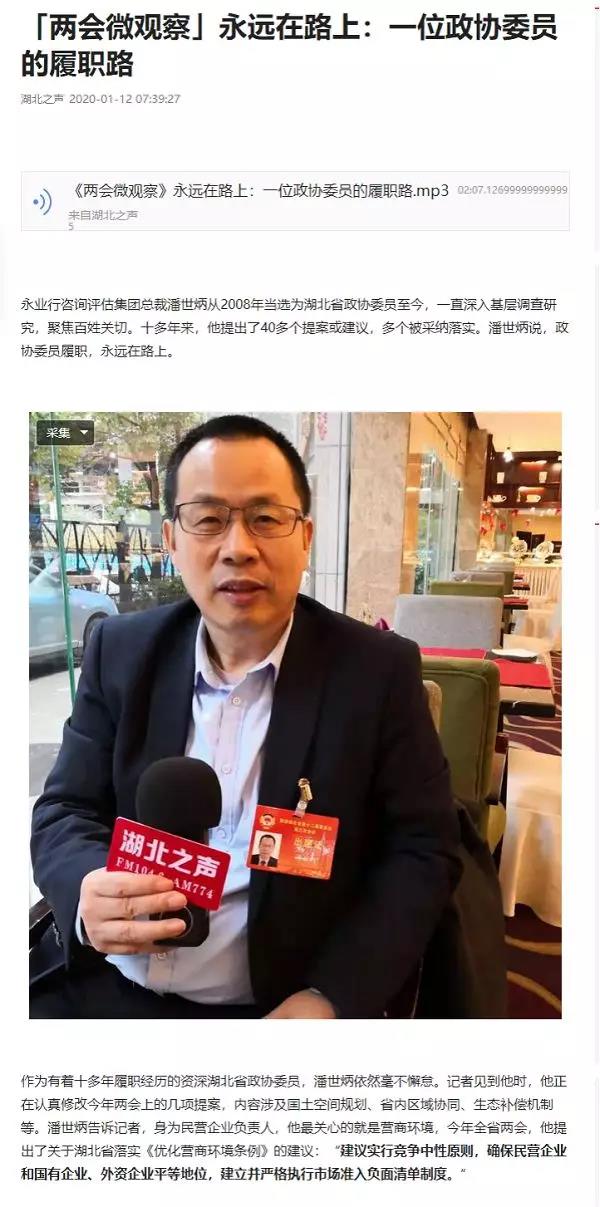 2020年1月11日至15日,政協(xié)湖北省十二屆三次會議在武漢召開。省政協(xié)委員、省房協(xié)會長、永業(yè)行董事長兼總裁潘世炳參加會議,并向大會提交了《關(guān)于推進湖北省實施生態(tài)補償?shù)慕ㄗh》《關(guān)于推進國土空間規(guī)劃的幾個建議》《關(guān)于湖北省落實<優(yōu)化營商環(huán)境條例>的幾點建議》《深化區(qū)域協(xié)同 推動鄂黃黃臨空協(xié)同發(fā)展軸建設(shè)的幾點建議》等多份提案,人民網(wǎng)、《中國經(jīng)營報》、《湖北日報》、湖北廣電、湖北之聲、長江云等多家媒體從多個角度對潘世炳委員的提案進行了深度挖掘和報道。