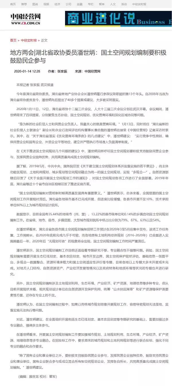 湖北省政協(xié)委員潘世炳:國土空間規(guī)劃編制要積極鼓勵民企參與
