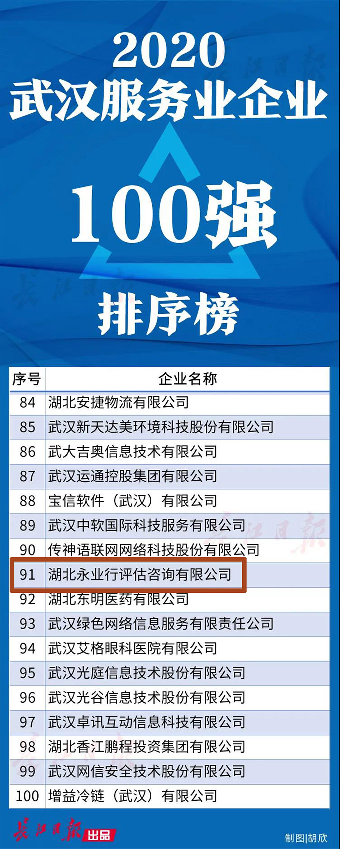 2020年9月25日,2020武漢企業(yè)100強、武漢制造業(yè)企業(yè)100強、武漢服務業(yè)企業(yè)100強正式發(fā)布,永業(yè)行憑借良好的發(fā)展態(tài)勢和經(jīng)營業(yè)績,上榜2020武漢服務業(yè)企業(yè)百強榜單,這是繼2018年、2019年獲得“武漢服務業(yè)企業(yè)100強”后,永業(yè)行又一次獲此殊榮。