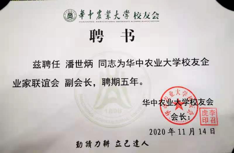 2020年11月14日,華中農(nóng)業(yè)大學(xué)校友企業(yè)家聯(lián)誼會(huì)換屆大會(huì)在武漢舉行。永業(yè)行董事長(zhǎng)、總裁潘世炳再次當(dāng)選為華中農(nóng)業(yè)大學(xué)校友企業(yè)家聯(lián)誼會(huì)副會(huì)長(zhǎng)。