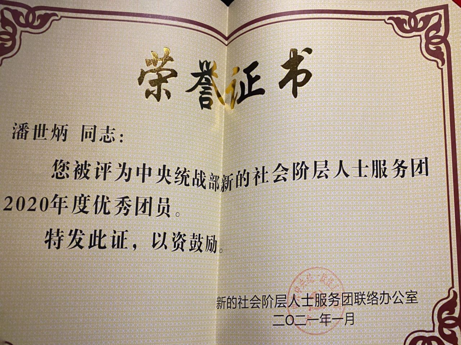 2021年1月14日,中央統(tǒng)戰(zhàn)部在線上線下召開(kāi)新的社會(huì)階層人士服務(wù)團(tuán)2020年度工作會(huì)議。省政協(xié)委員、永業(yè)行董事長(zhǎng)潘世炳作為六分團(tuán)成員參加會(huì)議,并榮獲“中央統(tǒng)戰(zhàn)部新的社會(huì)階層人士服務(wù)團(tuán)2020年度優(yōu)秀團(tuán)員”稱(chēng)號(hào)。