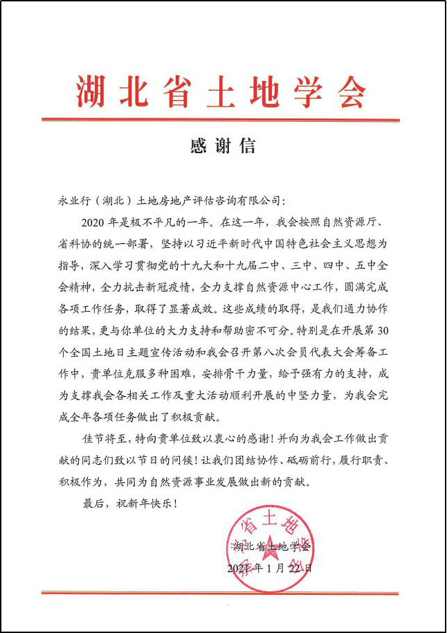 2020年是極不平凡的一年,在這一年里,永業(yè)行全力抗擊新冠疫情,積極配合湖北省土地學(xué)會各項(xiàng)工作,助力自然資源事業(yè)發(fā)展,受到湖北省土地學(xué)會的積極肯定,于2021年1月收到湖北省土地學(xué)會發(fā)來的感謝信。