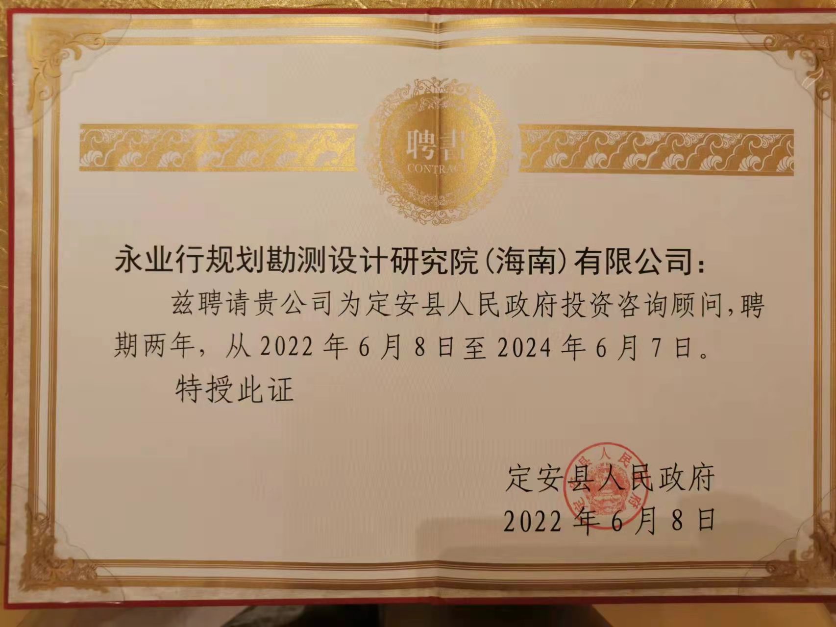 2022年7月1日,海南省定安縣舉行招商引資重點項目簽約及定安縣政府顧問聘任儀式,永業(yè)行受聘為定安縣政府投資咨詢顧問,聘期兩年。定安縣委書記劉峰松,縣委副書記、縣長馮云飛,縣委常委、副縣長黃海鵠等參加會議。