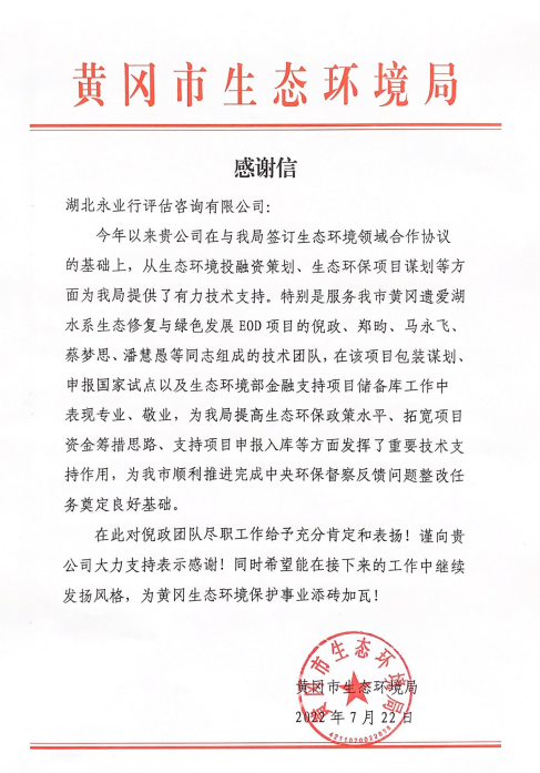 7月22日,黃岡市生態(tài)環(huán)境局致函永業(yè)行,對(duì)我司在生態(tài)環(huán)境投融資策劃、生態(tài)環(huán)保項(xiàng)目謀劃工作給予肯定和感謝。