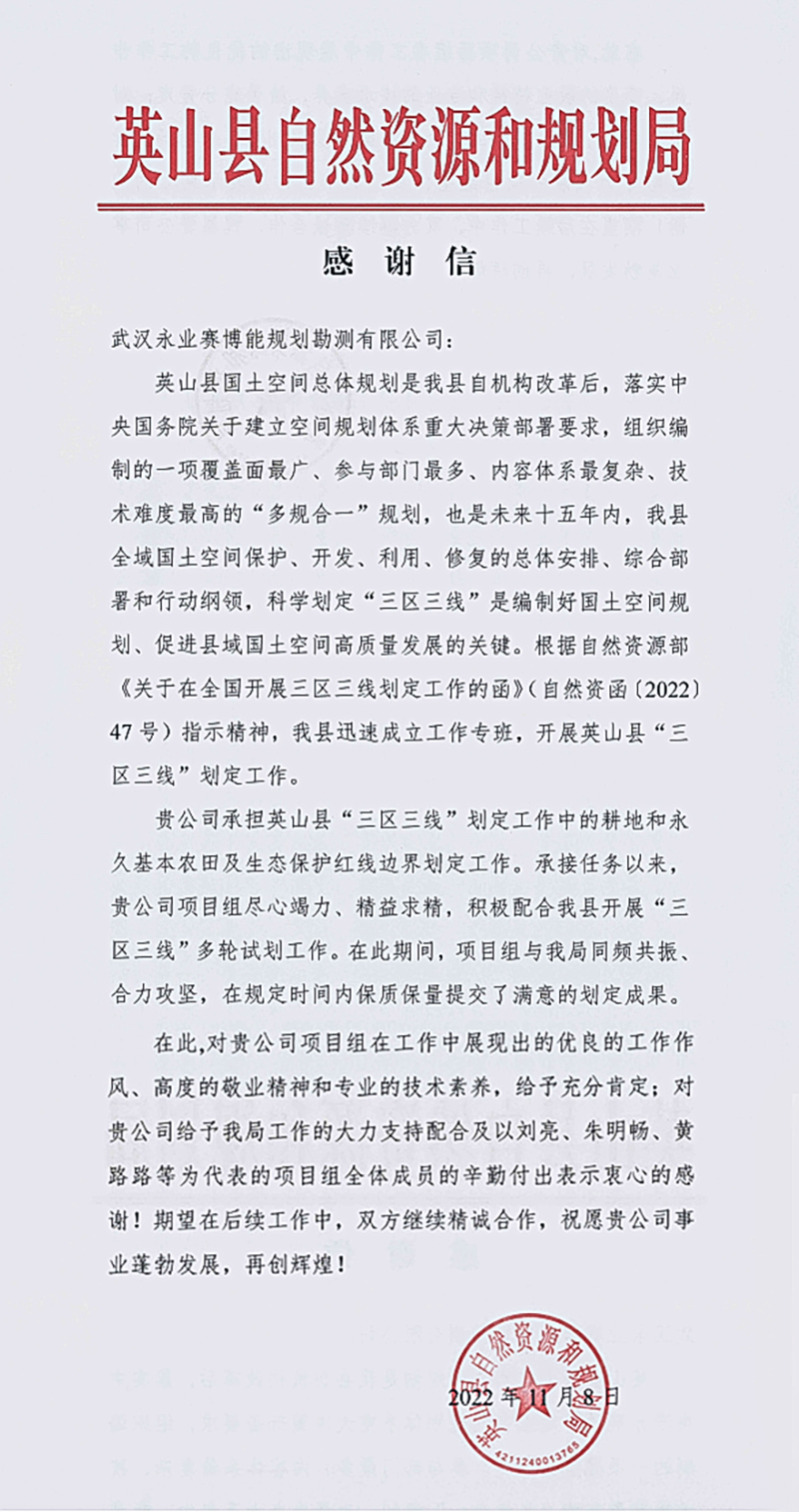 11月8日,英山縣自然資源和規(guī)劃局致函永業(yè)行,對我司承擔(dān)的英山縣永久基本農(nóng)田、生態(tài)保護紅線劃定工作表示充分肯定和衷心感謝。