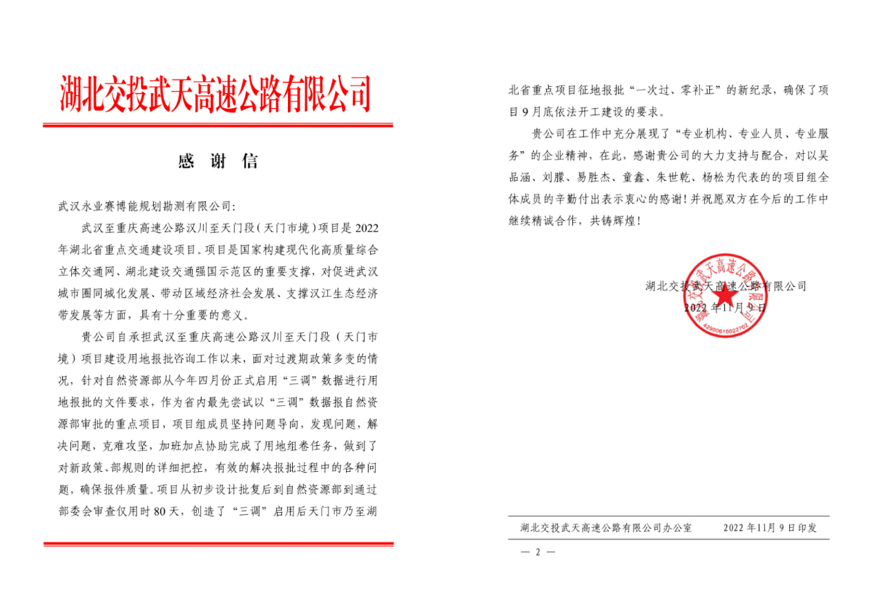 2022年11月,永業(yè)行陸續(xù)獲湖北交投武天高速公路有限公司、大悟縣自然資源和規(guī)劃局致函感謝。