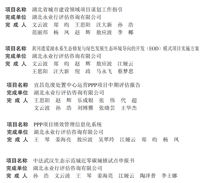 近日,湖北省工程咨詢協(xié)會(huì)發(fā)布2022年湖北省工程咨詢成果評(píng)價(jià)結(jié)果公告,永業(yè)行申報(bào)的5項(xiàng)成果均獲獎(jiǎng),其中:《湖北省城市建設(shè)領(lǐng)域項(xiàng)目謀劃工作指引》《黃岡遺愛(ài)湖水系生態(tài)修復(fù)與綠色發(fā)展生態(tài)環(huán)境導(dǎo)向的開(kāi)發(fā)(EOD)模式項(xiàng)目實(shí)施方案》《宜昌危廢處置中心運(yùn)營(yíng)PPP項(xiàng)目中期評(píng)估報(bào)告》榮獲二等獎(jiǎng),《PPP項(xiàng)目績(jī)效管理信息化系統(tǒng)》《中法武漢生態(tài)示范城近零碳城鎮(zhèn)試點(diǎn)申報(bào)書(shū)》榮獲三等獎(jiǎng)。