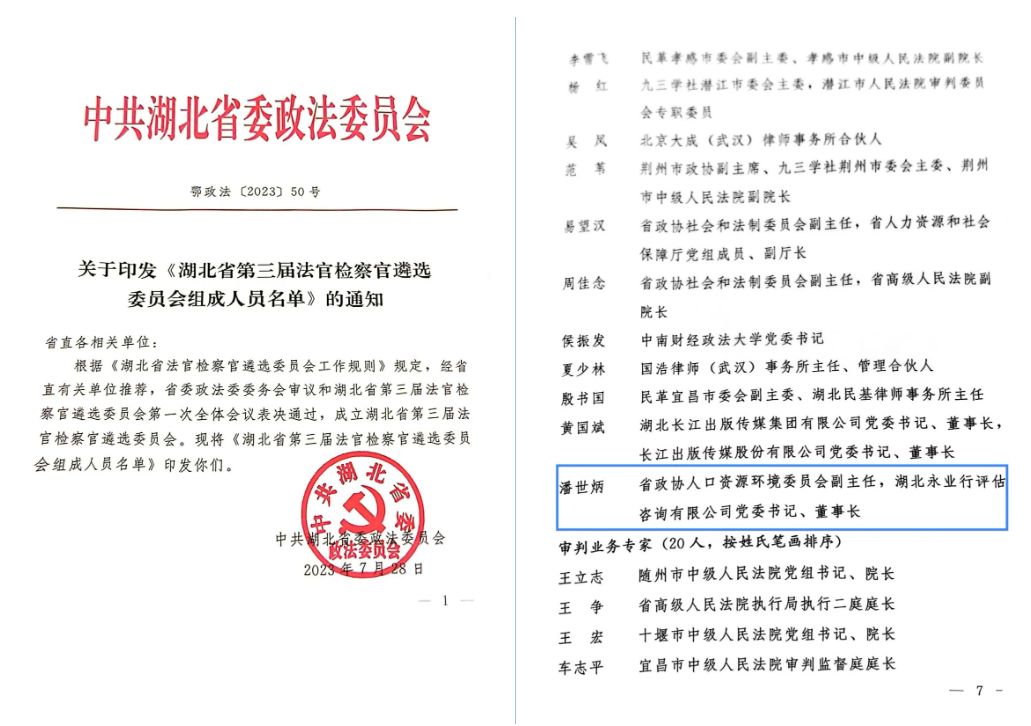2023年7月28日,湖北省第三屆法官檢察官遴選委員會(huì)第一次全體會(huì)議在武漢市東湖賓館召開。省委常委、政法委書記肖菊華到會(huì)祝賀并講話。省高級(jí)人民法院黨組書記、院長(zhǎng)游勸榮主持會(huì)議。省人民檢察院黨組書記、檢察長(zhǎng)王守安宣讀第三屆遴選委員會(huì)組成人員名單。省政協(xié)常委、永業(yè)行黨委書記、董事長(zhǎng)潘世炳受聘為湖北省第三屆法官檢察官遴選委員會(huì)專家委員。