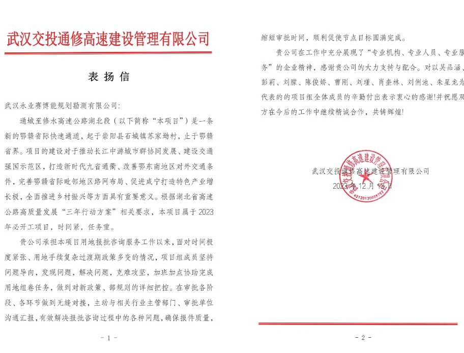 近期,永業(yè)行陸續(xù)收到來自武漢都市區(qū)環(huán)線西南段投資管理有限公司、武漢交投通修高速建設管理有限公司、湖北省交通規(guī)劃設計院股份有限公司、武荊宜高速公路荊門段建設指揮部發(fā)來的表揚信和感謝信。信中充分肯定了我司“專業(yè)機構、專業(yè)人員、專業(yè)服務”的企業(yè)精神,表達持續(xù)精誠合作的美好意愿,并給予我司事業(yè)蓬勃發(fā)展,再創(chuàng)佳績的良好祝愿。