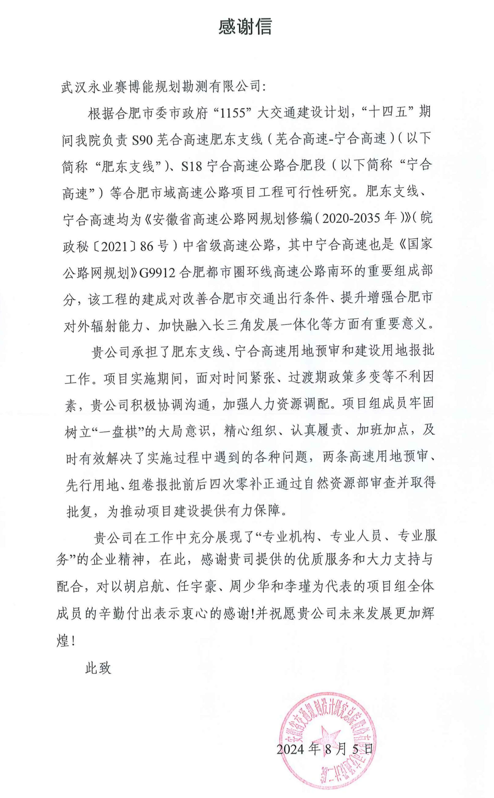 感謝信稱,S18寧合高速公路合肥段、S90蕪合高速肥東支線(蕪合高速-寧合高速)均為省級高速公路。自永業(yè)行承接項目用地預(yù)審和建設(shè)用地報批工作以來,面對時間緊張、任務(wù)重、過渡期政策多變的挑戰(zhàn),項目組成員(胡啟航、任宇豪、周少華、李瑾等)展現(xiàn)了高度的專業(yè)精神和職業(yè)素養(yǎng),通過對新政策、新規(guī)則的精準(zhǔn)把控,合理分解任務(wù),有效解決問題,實現(xiàn)了兩條高速公路用地預(yù)審、先行用地、組卷報批零補(bǔ)正通過自然資源部審查,獲得業(yè)主好評。