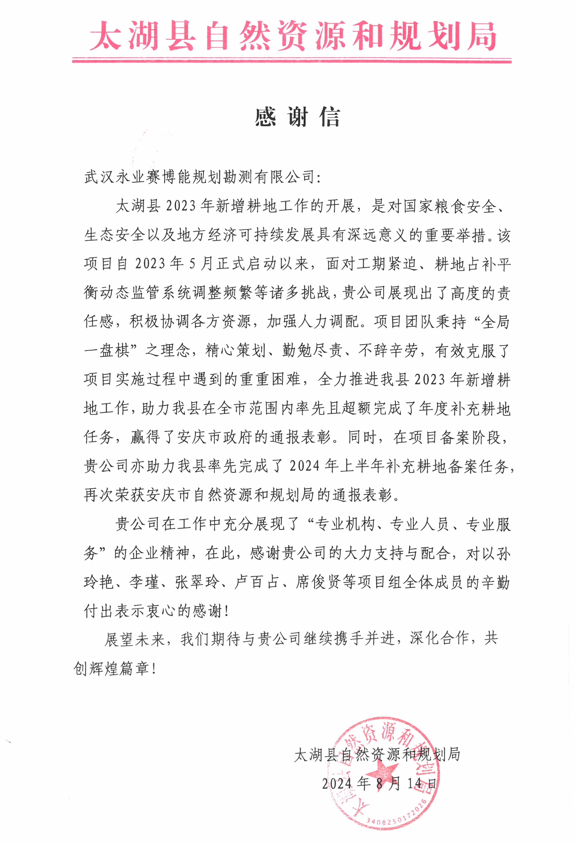 信中提到永業(yè)行在面對工期緊迫、耕地占補(bǔ)平衡動態(tài)監(jiān)管系統(tǒng)調(diào)整等諸多挑戰(zhàn),項目組成員(孫玲艷、李瑾、張翠玲、盧百占、席俊賢等)秉持“全局一盤棋”之理念,精心策劃、勤勉盡責(zé)、不辭辛勞,有效克服了項目實施過程中遇到的重重困難,全力推進(jìn)了太湖縣2023年新增耕地工作,助力太湖縣在安慶市范圍內(nèi)率先且超額完成了年度補(bǔ)充耕地任務(wù),同時在項目備案階段助力太湖縣率先完成了2024年上半年補(bǔ)充耕地備案任務(wù),贏得了安慶市政府、安慶市自然資源和規(guī)劃局的通報表彰。
