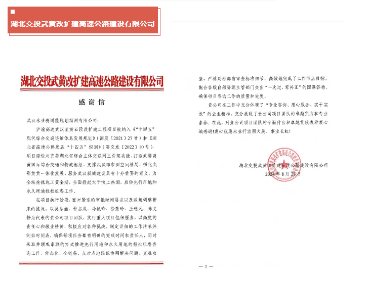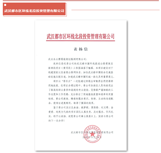 近期,永業(yè)行陸續(xù)收到來自武漢都市區(qū)環(huán)線北段投資管理有限公司、湖北交投武黃改擴建高速公路建設(shè)有限公司、湖北交投花湖機場高速公路有限公司發(fā)來的表揚信和感謝信。