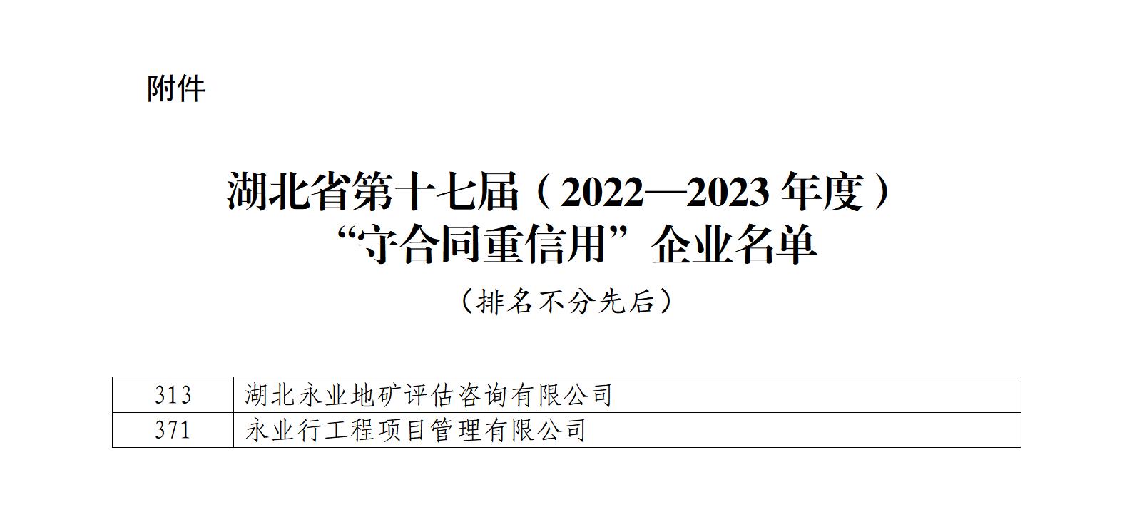 2024年10月21日,湖北省市場(chǎng)監(jiān)督管理局公布了湖北省第十七屆 (2022—2023年度)“守合同重信用”企業(yè)名單。成員機(jī)構(gòu)湖北永業(yè)地礦評(píng)估咨詢有限公司、永業(yè)行工程項(xiàng)目管理有限公司榜上有名,連續(xù)十三年獲評(píng)湖北省“守合同重信用企業(yè)”。