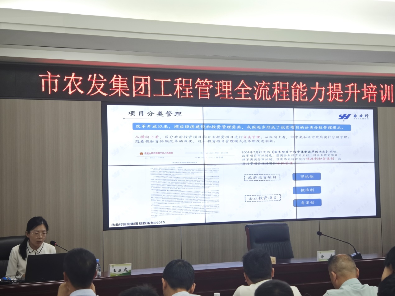 2025年5月12日,潛江市農業(yè)發(fā)展集團有限公司組織召開“市農發(fā)集團工程管理全流程能力提升培訓會”,市農發(fā)集團副總經理涂濤主持會議。永業(yè)行投資金融事業(yè)群工程咨詢事業(yè)部總監(jiān)王成成受邀作《建設項目全流程管理》專題培訓。